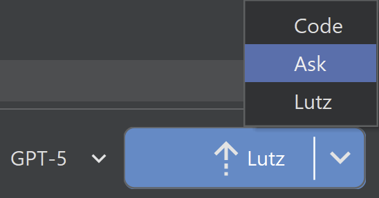 Besides Lutz Mode (described in Quick Start), Brokk supports a lower level of manual control. You can click on the arrow in the Lutz button to select a different action, or use the hotkey (Ctrl/Cmd + M) to toggle between them:
