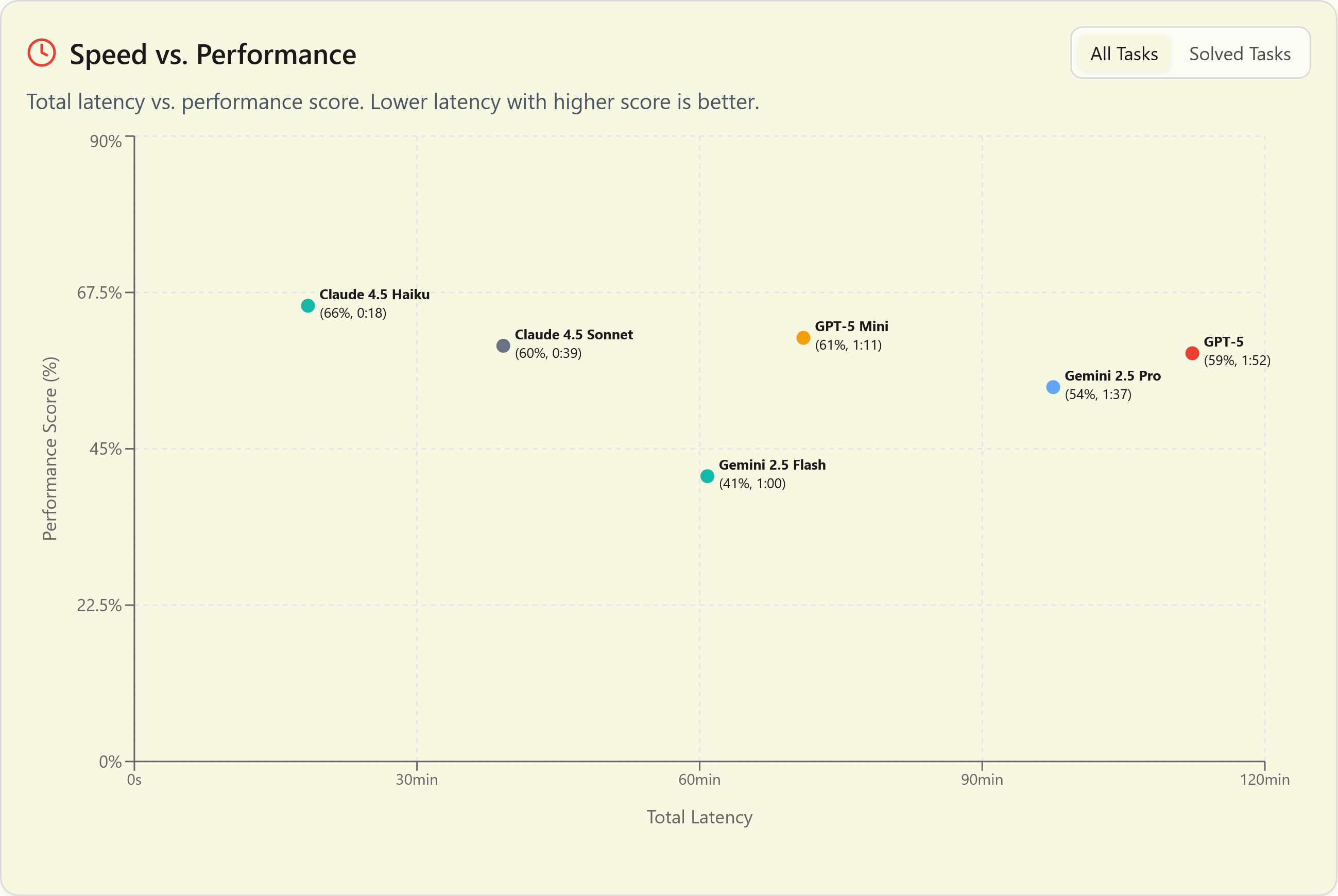 But Haiku 4.5 is wicked fast. Twice as fast as the next-fastest model, its big brother Sonnet 4.5. Which makes it over 3x faster than GPT-5 mini, and almost 6x faster than full GPT-5.
