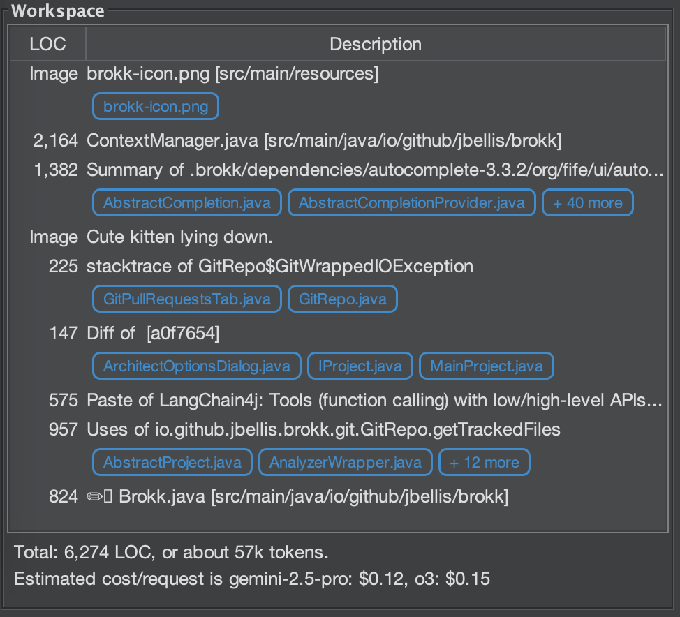 You can still drill down to the level of individual lines of code if necessary, but this is a secondary consideration; if you are doing that routinely then something has gone wrong. This makes Brokk a very different animal than what everyone is used to! but we think it’s necessary to turn context from an afterthought into the central concern of modern programming.