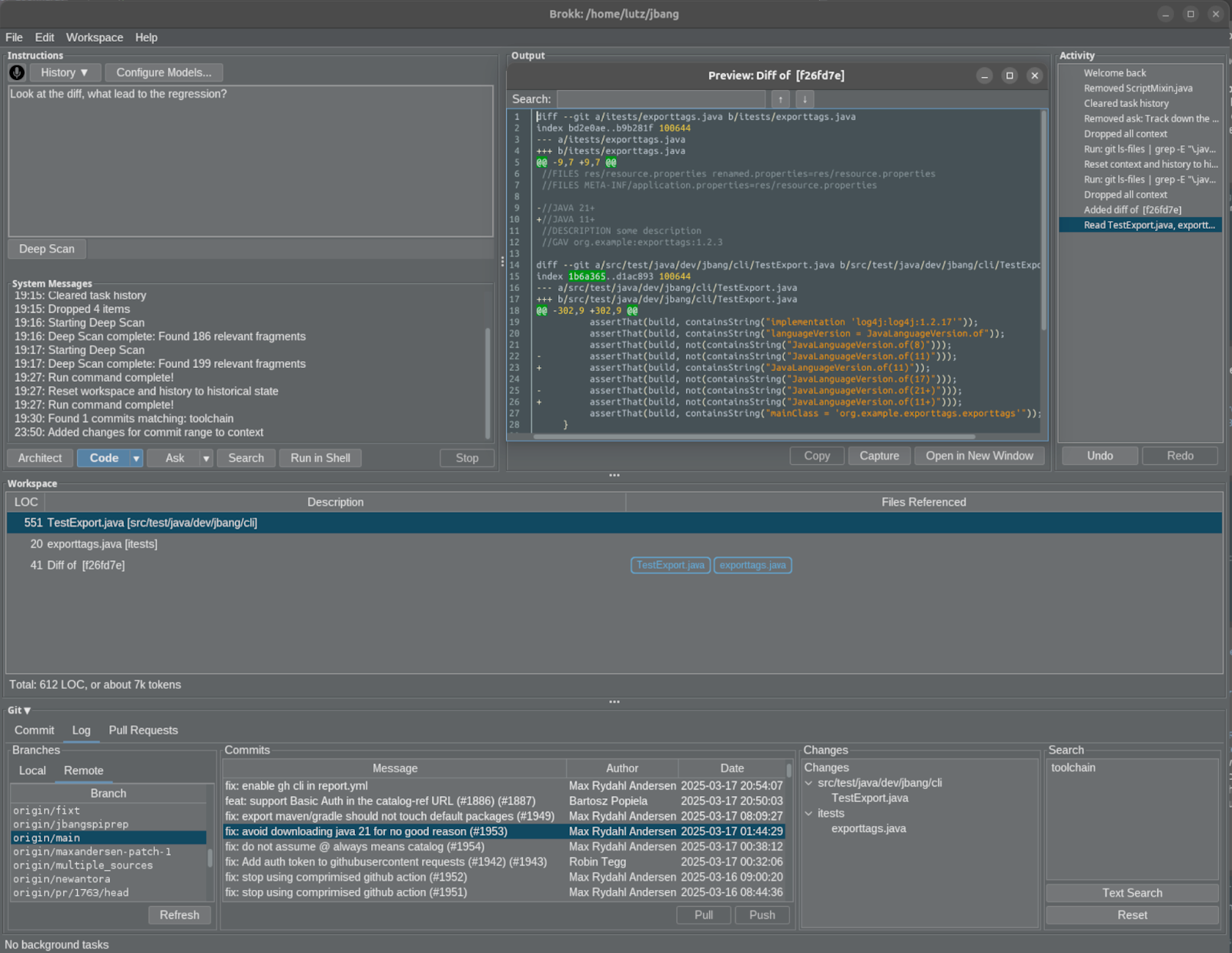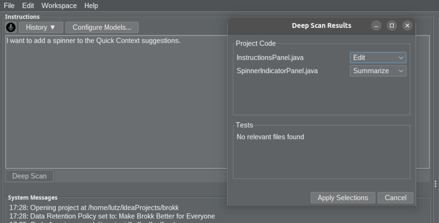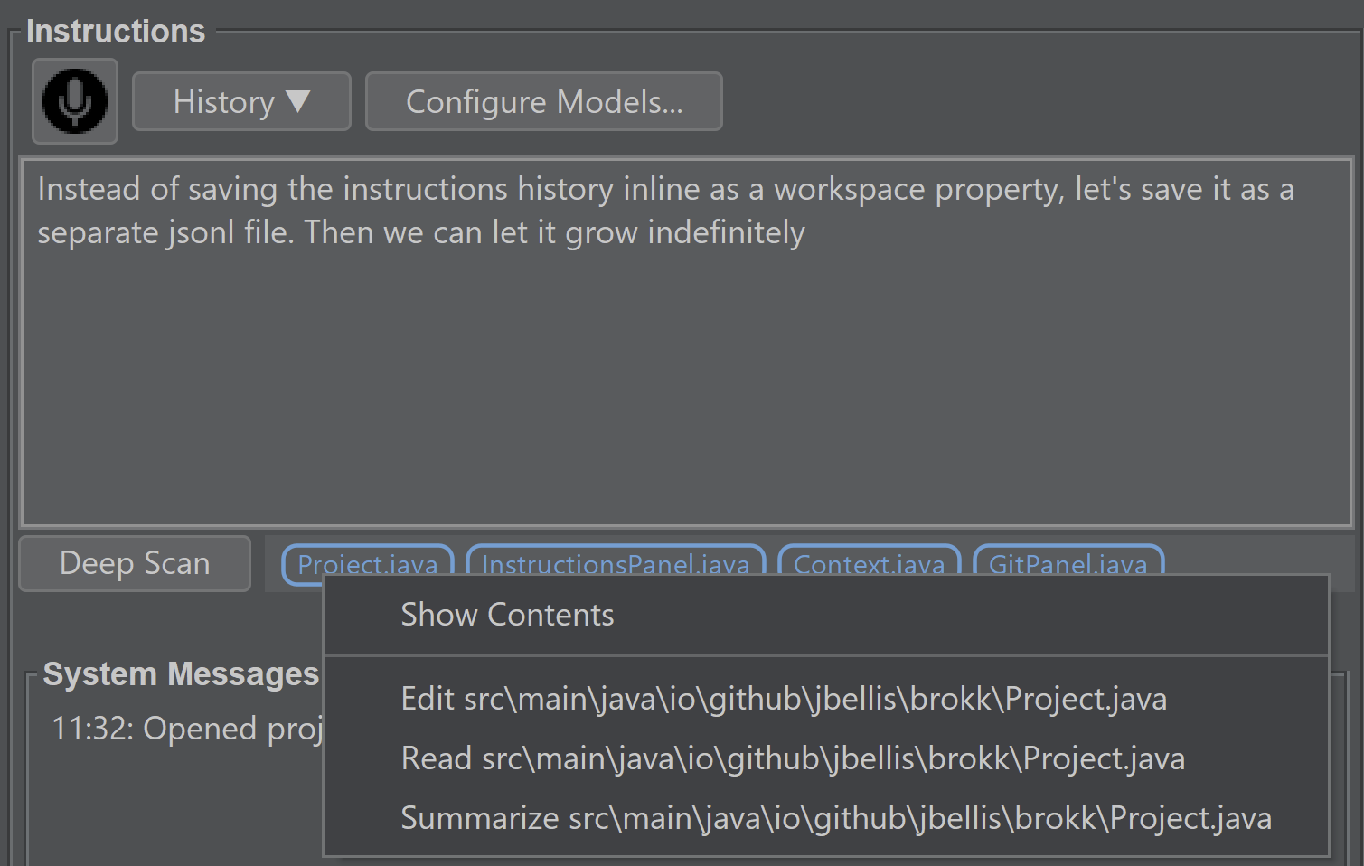 Middle-sized refactors or an unfamiliar area? Run Deep Scan to pull in a list of every relevant file, plus Brokk’s suggestions about whether each file should be read, edited or summarised and which tests to run. Because it relies on summaries to keep latency low, Deep Scan won’t show you every implementation detail (e.g. hunting every System.out.println), but it’s perfect for building context quickly.