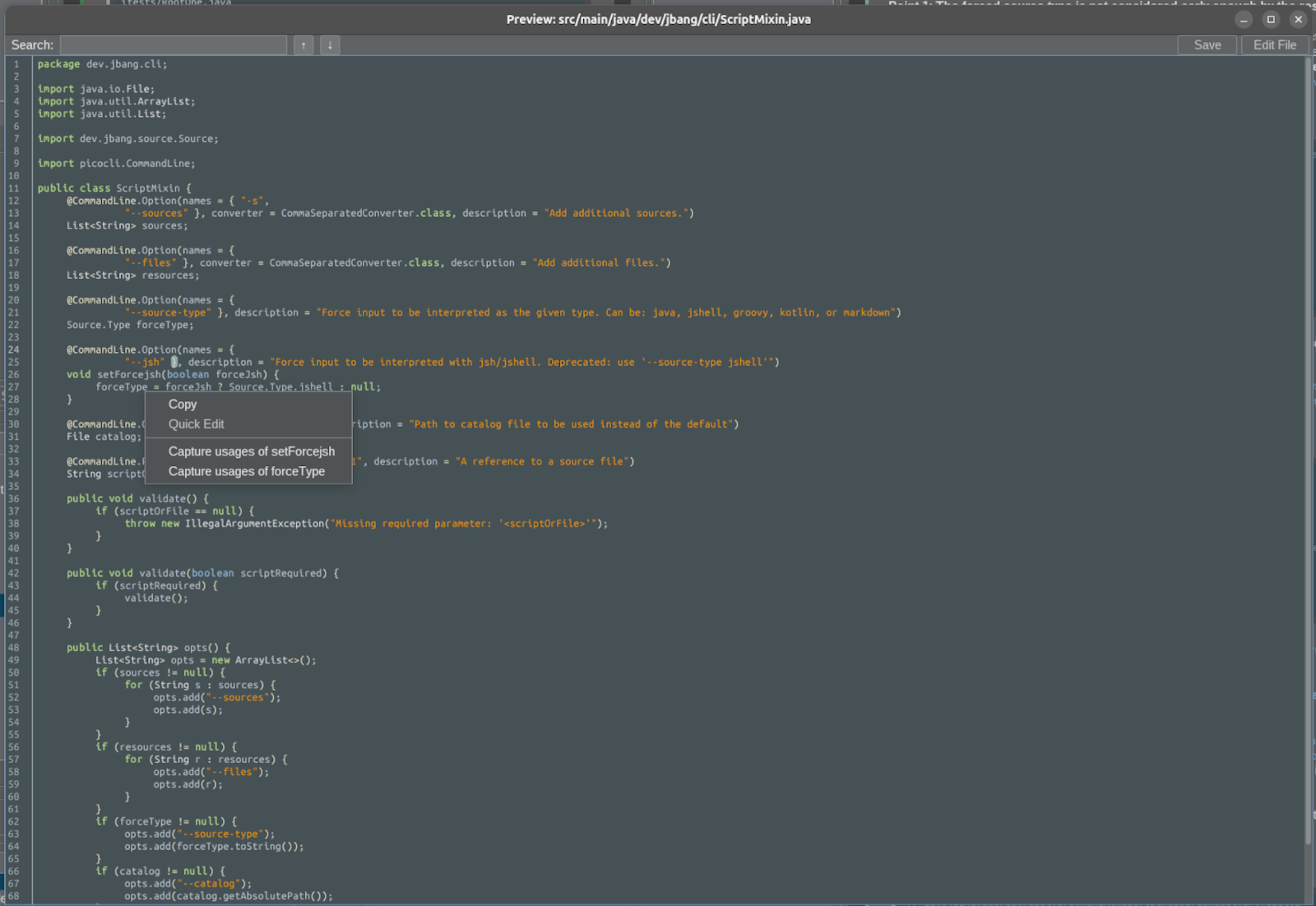 - Capture usages of classes, methods or variables: right-click a definition and add its usages to the Workspace as a brand-new fragment.