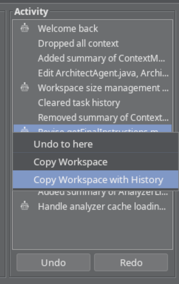 Handle side-quests Need to research something unrelated? Purge the context table with Drop All, explore freely, then jump back to where you were at with Copy Workspace with History and paste any findings into the main context.