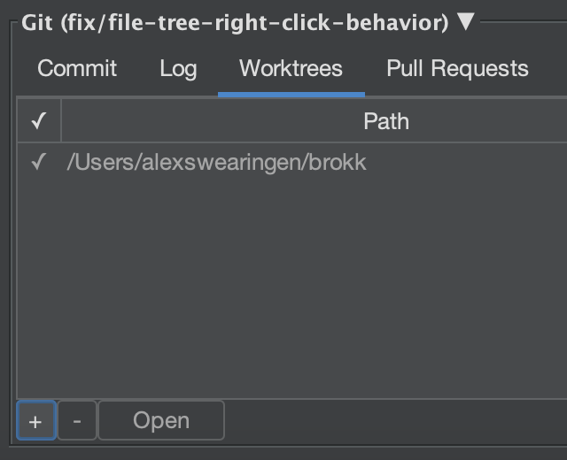 In the Git panel, navigate to the "Worktrees" tab and hit the "+" icon to create a new worktree: