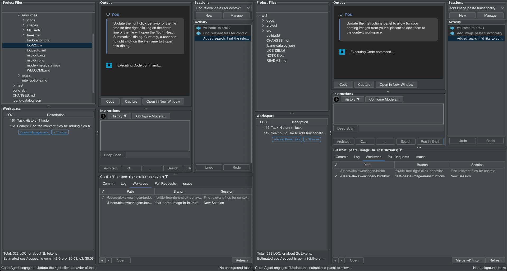 ...and Voilá, Brokk opens the new worktree in a second window, giving me two live workspaces: one focused on the UI improvements, the other dedicated to adding the clipboard functionality.