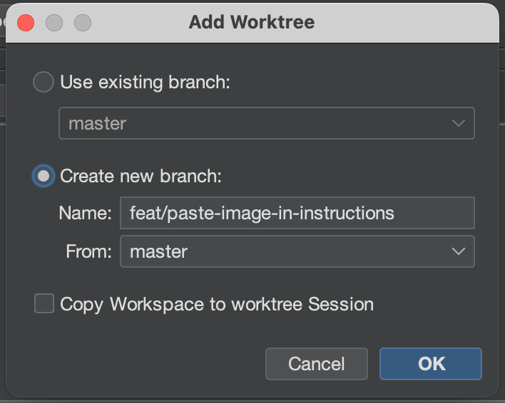 This will open a dialog where you can specify the branch name for this new worktree: