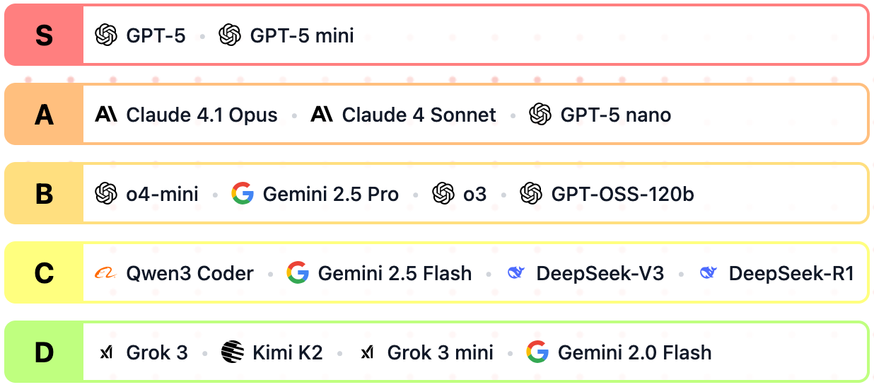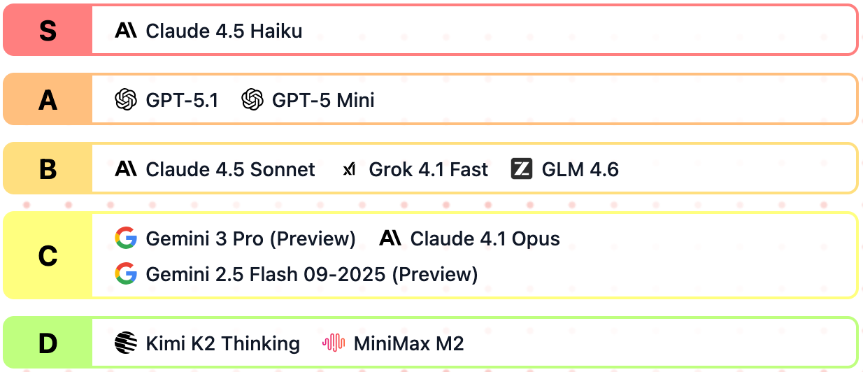 GPT 5.1 and GPT 5-Mini take places in the A Tier for the straightforward reason that these are the only models on the Pareto front for both speed and cost. GPT 5.1 (with priority processing) is my preferred planning model. Even with priority processing, it's slower than Sonnet, but it's enough smarter that it's worth it; with Sonnet I have to redo enough work that it doesn't save me time overall.