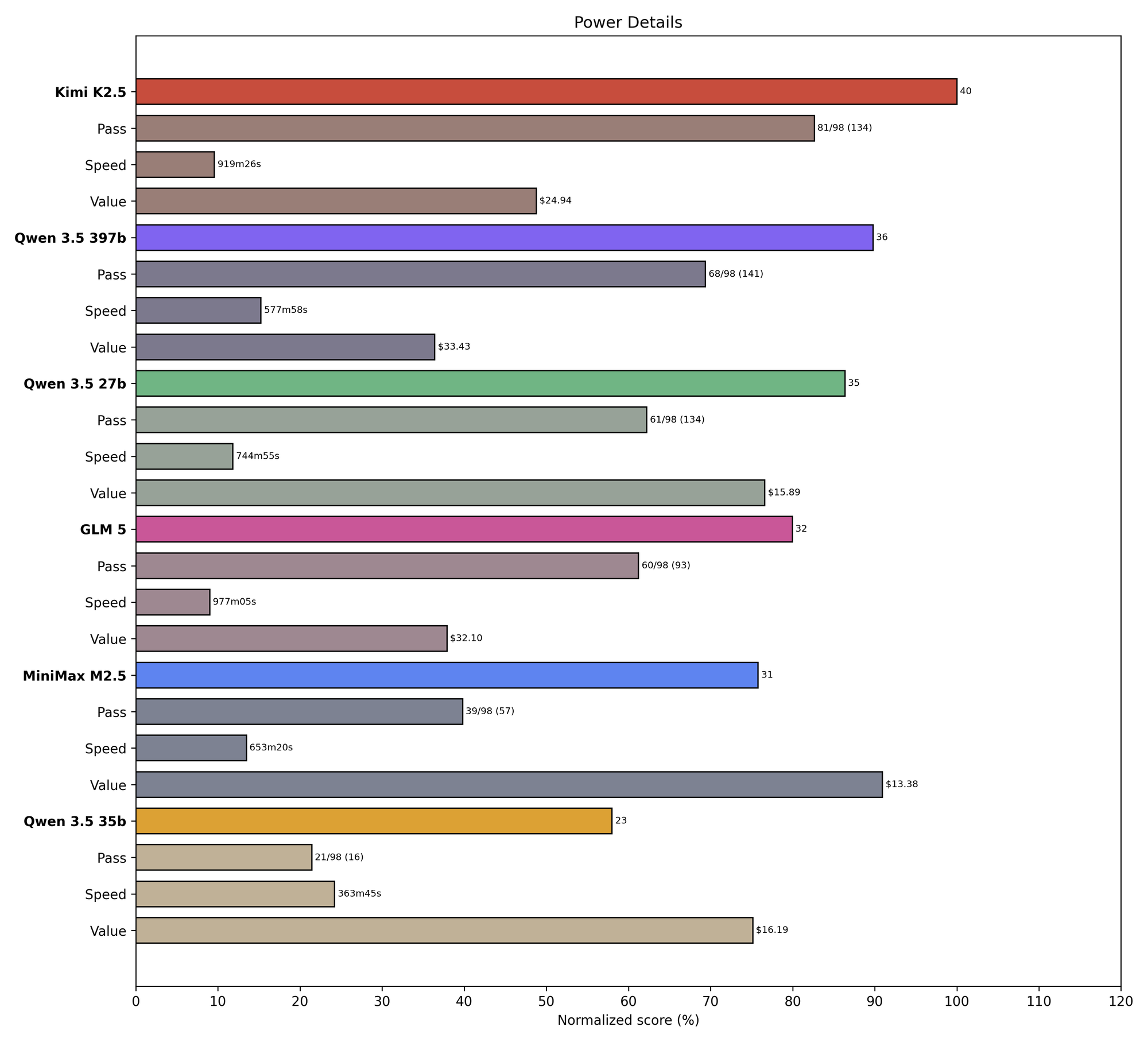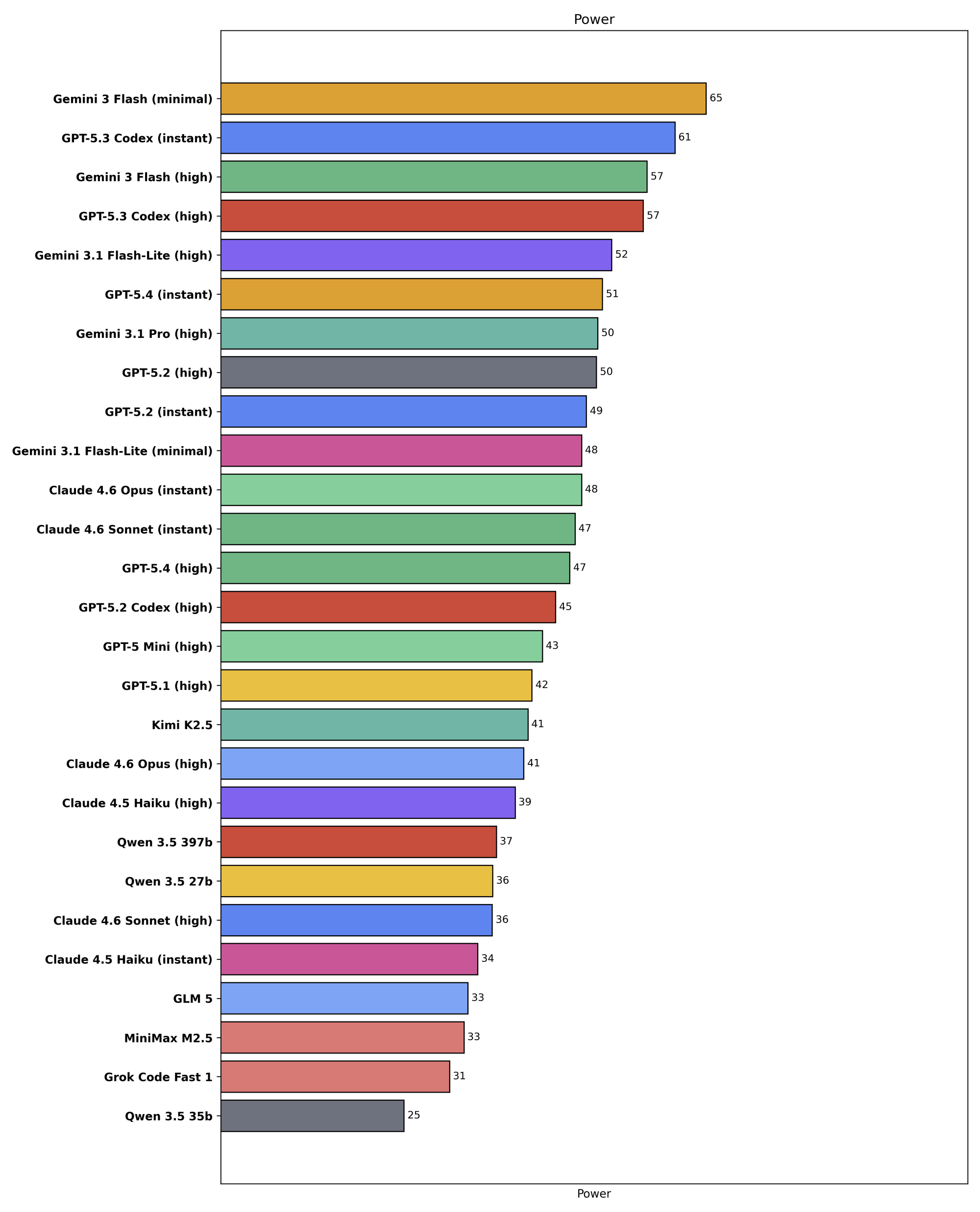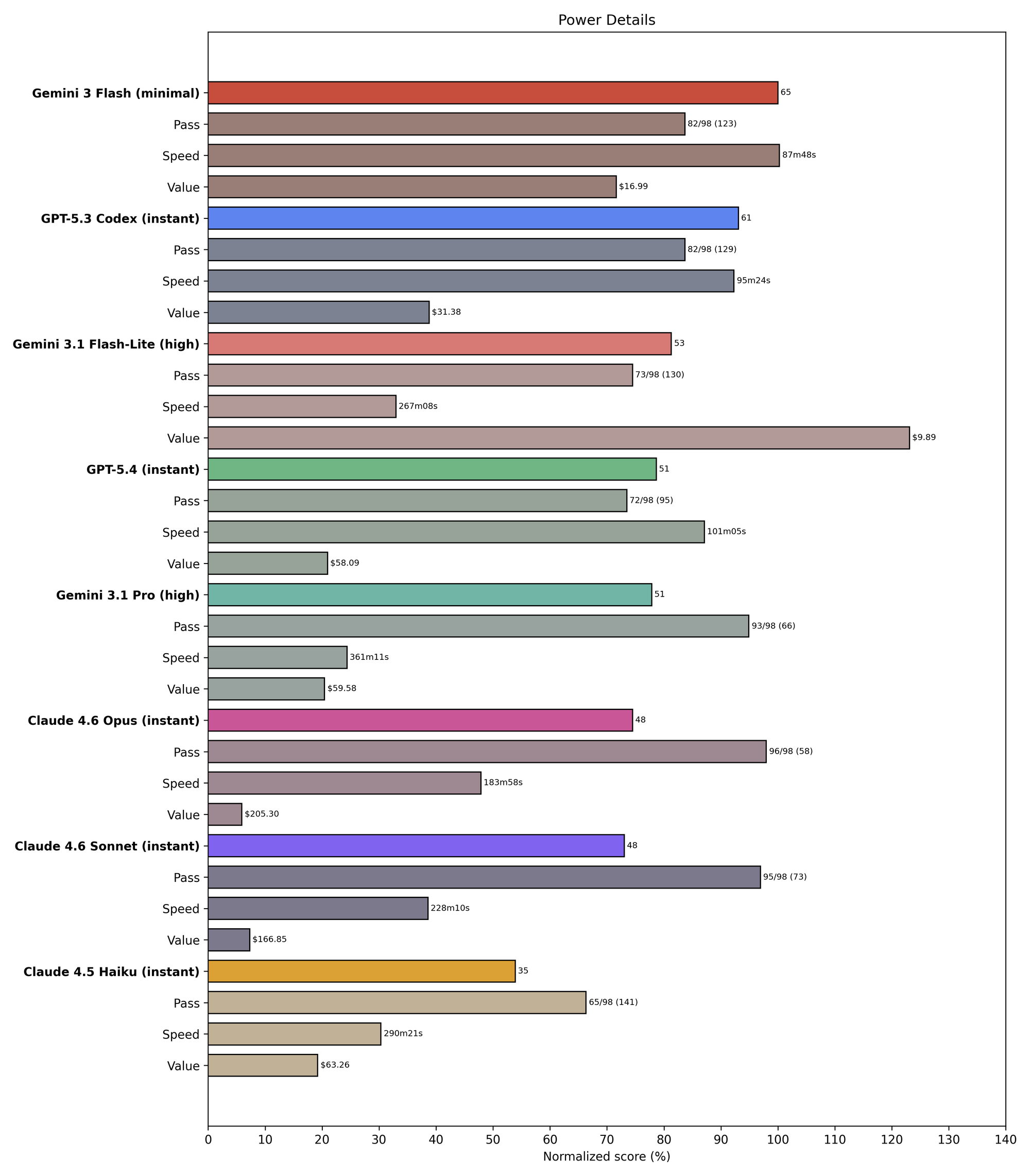 To solve this, we're adding visualizations of Value (inverse cost) and Speed (inverse latency), as well as Power (a weighted geometric mean of Score, Value, and Speed). Here's what this looks like for the strongest February finalist models, as well as the recently-released GPT 5.4, Codex 5.3, and Flash 3.1 Lite: