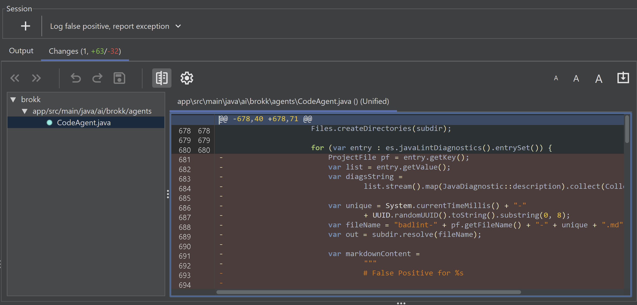 Besides looking at diffs from individual tasks, Brokk gives you an overview diff of all changes made in the current Session:
