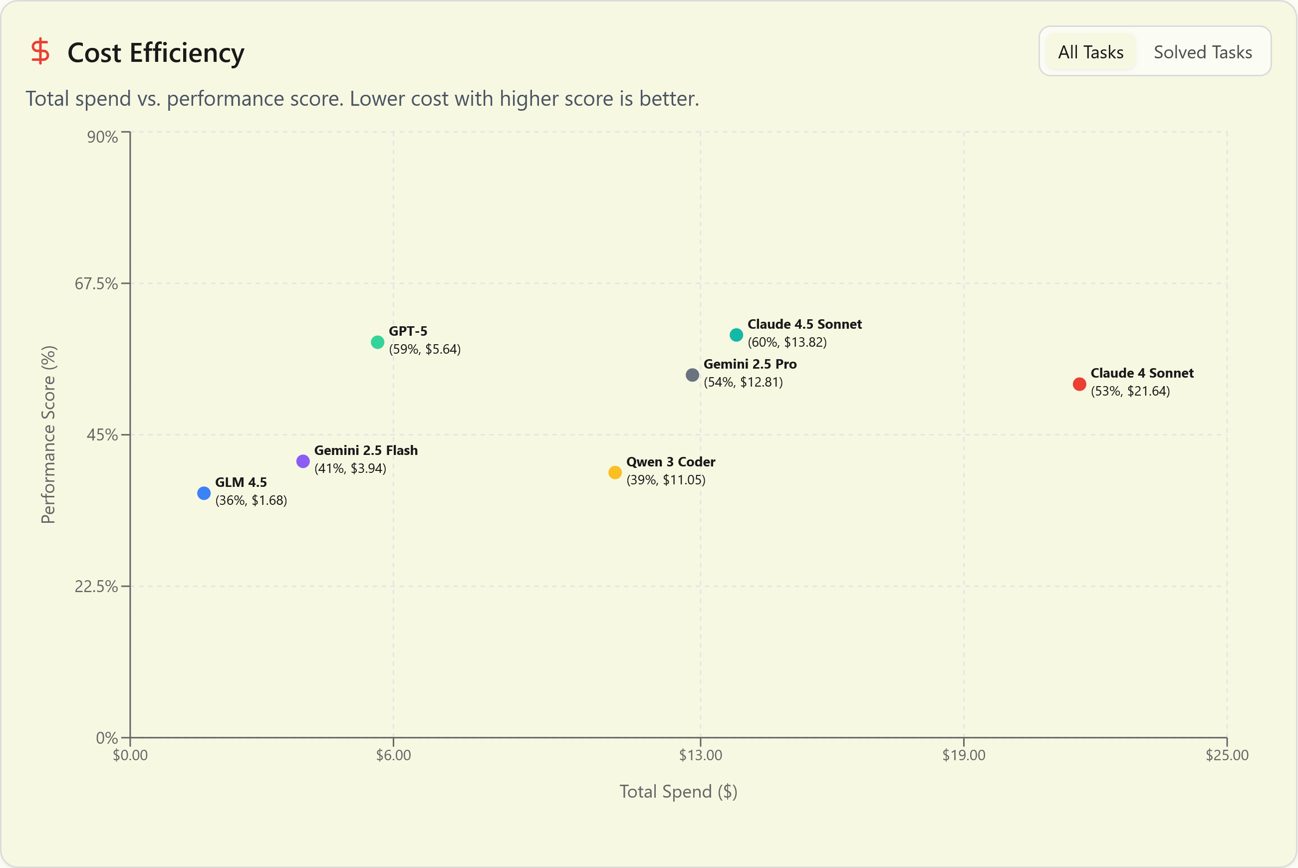 Interestingly, while Sonnet 4.5's price-per-token is unchanged, it uses those tokens more effectively, resulting in about a 40% improvement in real-world cost-effectiveness--almost closing the gap to Gemini 2.5 Pro.