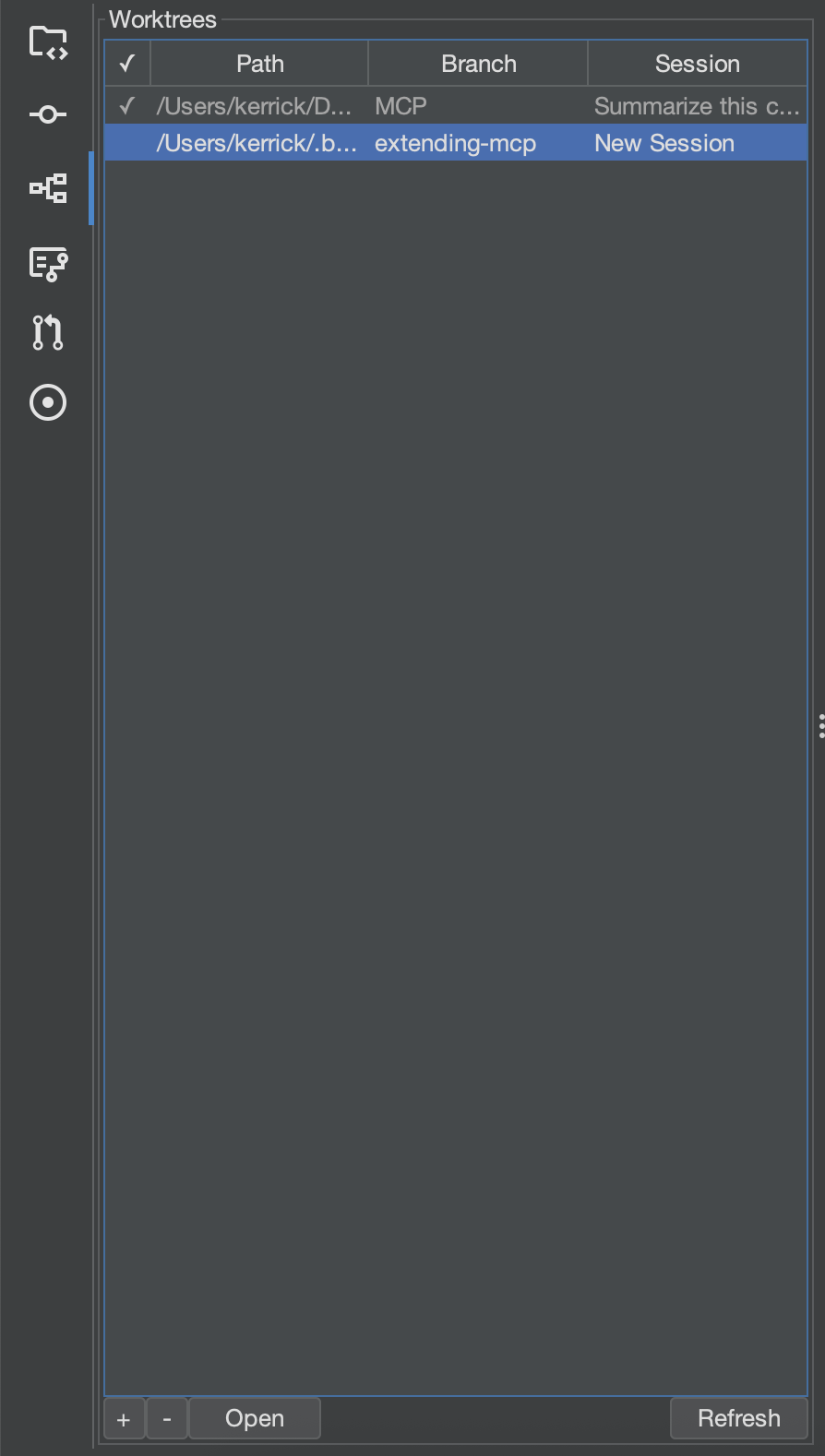 Add a new worktree with the + button; remove one with -.