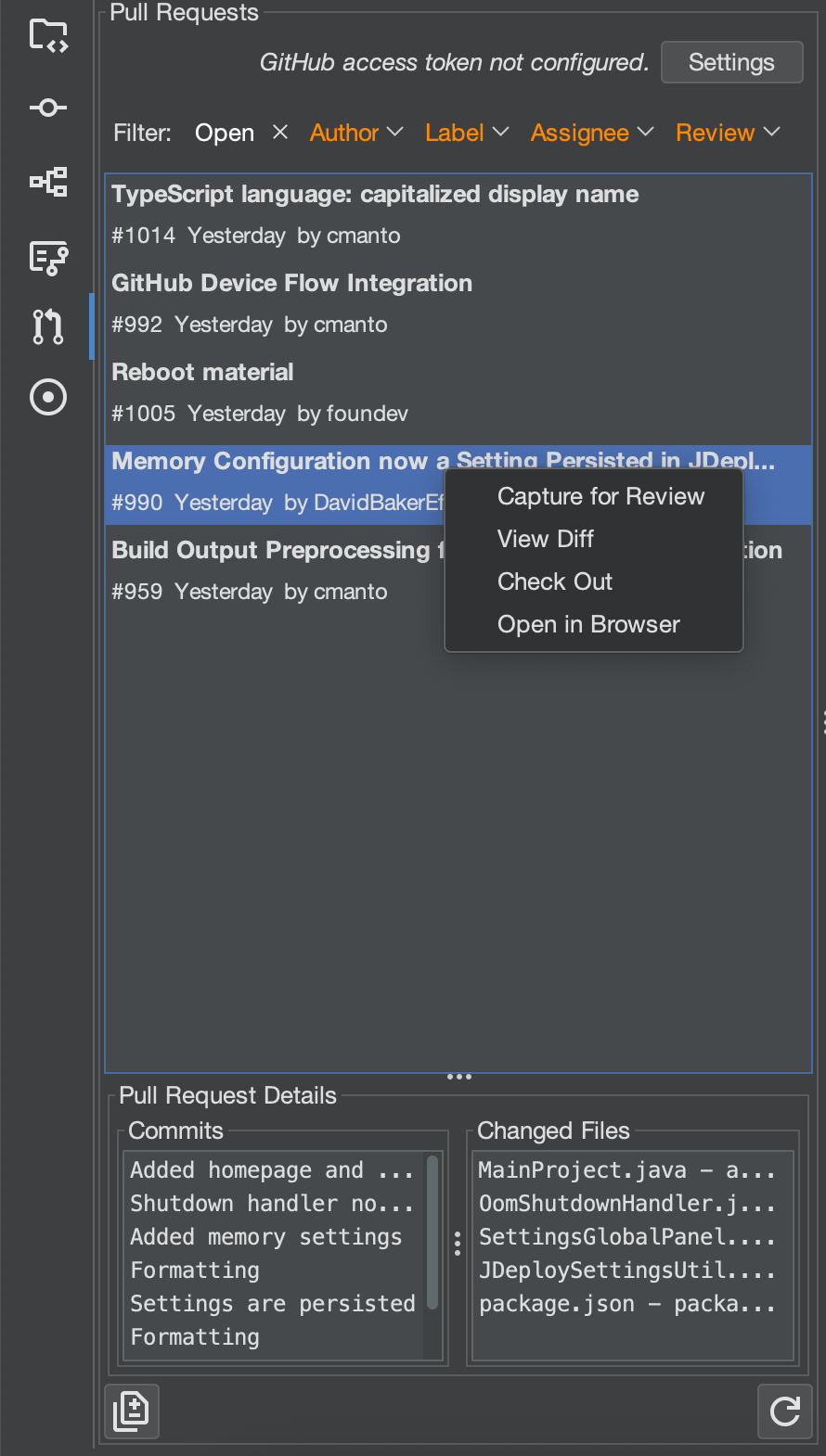 Narrow down PRs by Status, Author, Label, Assignee, or Review State. - PR Details Pane