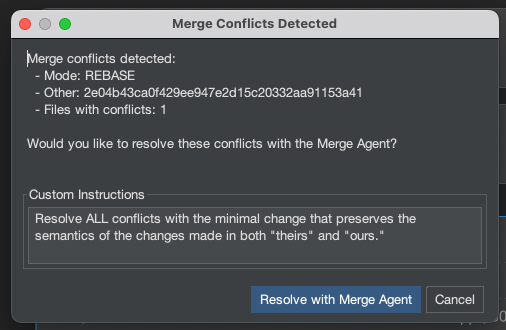 Brokk will automatically detect and offer to resolve Git merge conflicts for you, understanding the semantic intent behind code changes on both branches, not just textual differences.