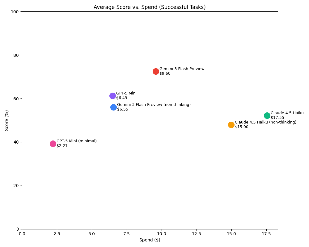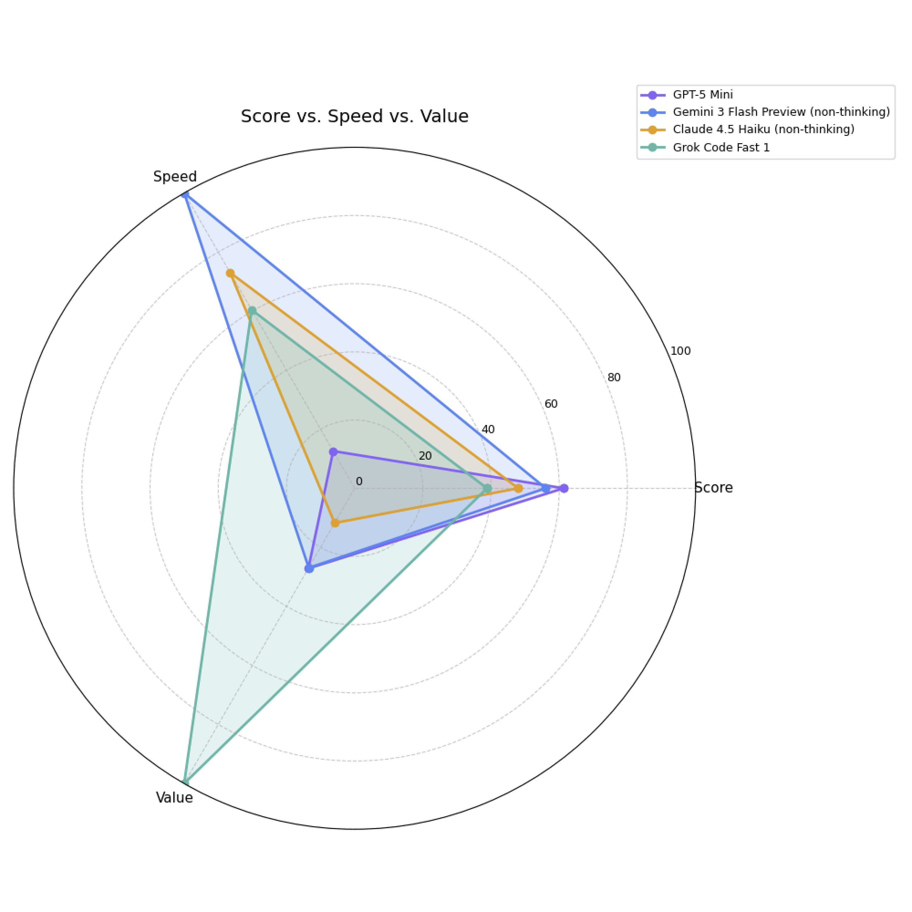 Flash 3 with thinking disabled is smarter, faster, and cheaper than its closest competition Haiku 4.5, and while it's not quite as smart as GPT-5 mini (with default reasoning), it's about the same price and 8x faster. Meanwhile, GPT-5 mini gives up significantly more intelligence with reasoning dialed back to minimal (the lowest 5 mini can go).